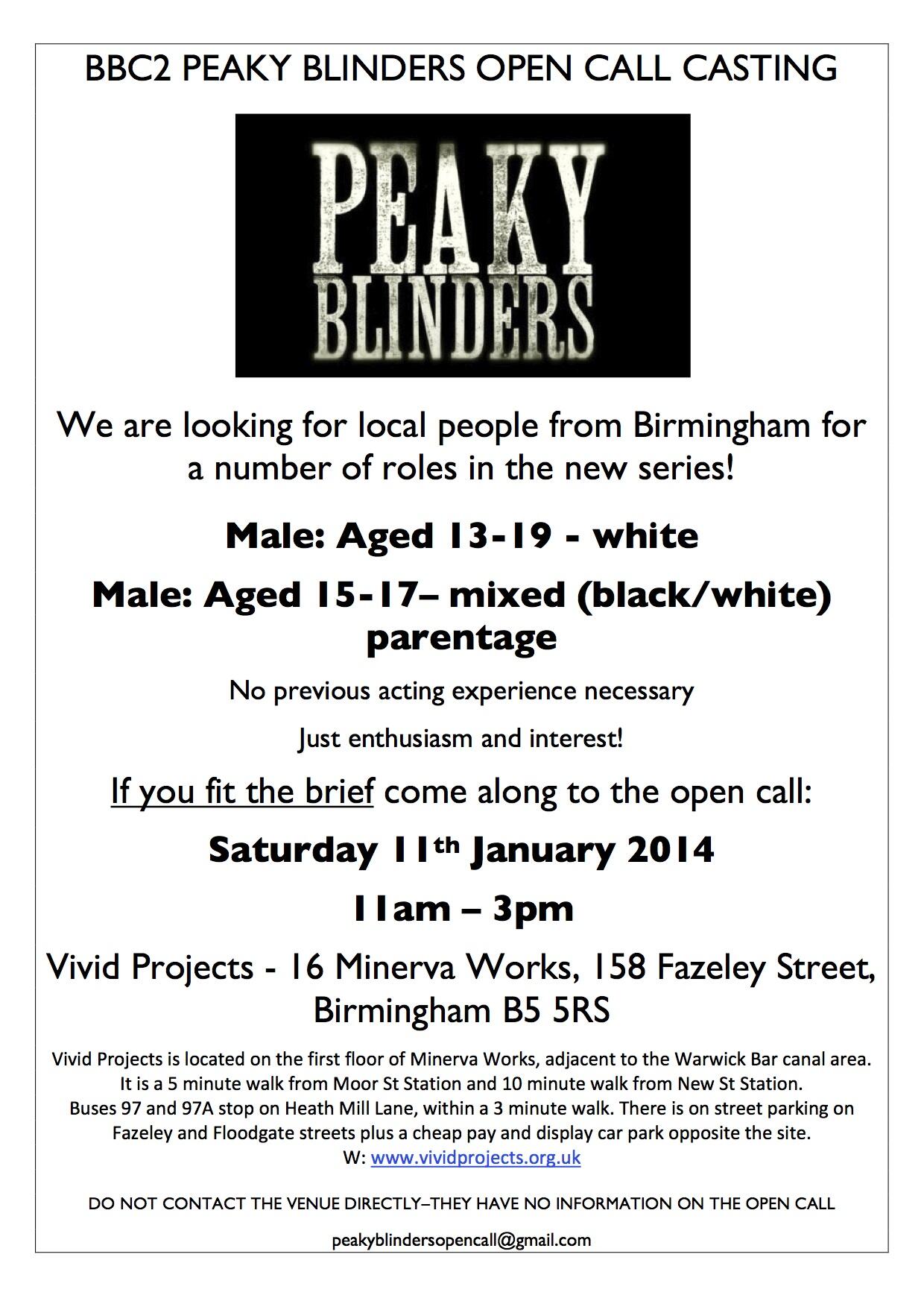 Open casting call for Birmingham males aged 13-19 years old on the Jan 11th 2014. See attached flyer for details